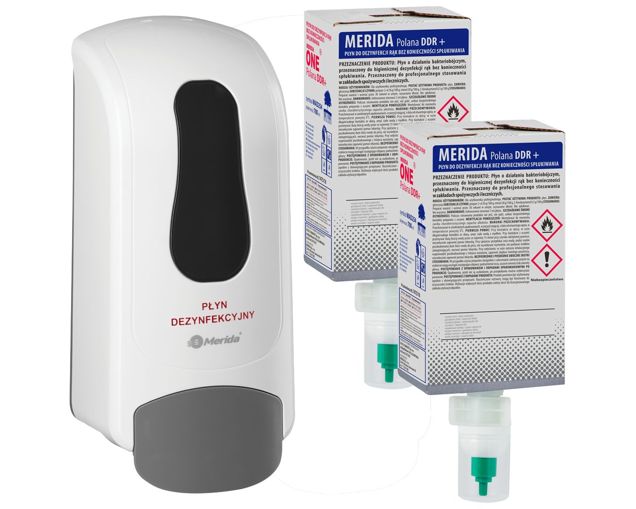 Dozownik płynu dezynfekcyjnego MERIDA ONE biały i dwa wkłady płynu dezynfekującego