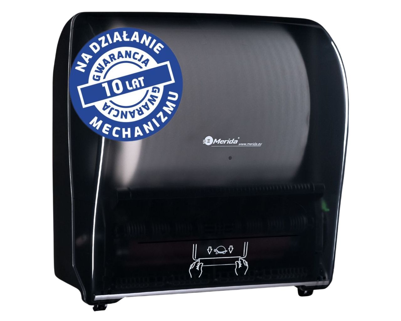 Mechaniczny podajnik ręczników papierowych w rolach MERIDA SOLID CUT AUTOMATIC MAXItworzywo ABS, front transparentny ciemny – połysktył pełen ciemny – połysk
