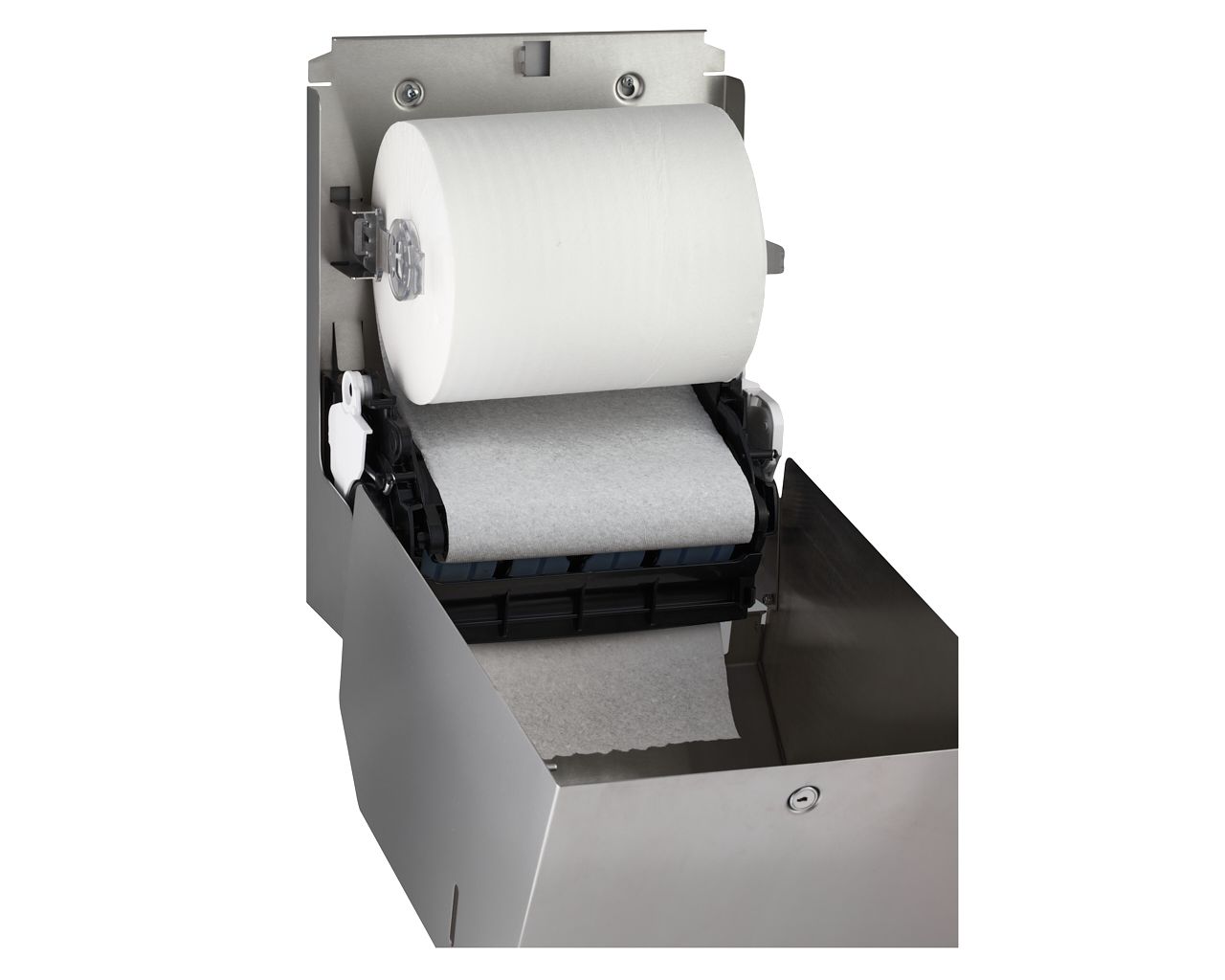 Mechaniczny podajnik ręczników papierowych zapewnia higieniczne użytkowanie, dotykany jest tylko pobierany ręcznik. Pobranie ręcznika uruchamia mechanizm odcinający listek o długości 25,5 cm. Urządzenie charakteryzuje się cichą i delikatną pracą mechanizmu odcinającego. W sytuacji awaryjnej ręcznik można wysunąć przez naciśnięcie dźwigni PUSH, znajdującej się w dolnej części podajnika. Uchwyt rolki wyposażony w system ułatwiający zakładanie ręcznika. Podajnik posiada łatwy dostęp do mechanizmu tnącego umożliwiający bezproblemowe czyszczenie oraz konserwację urządzenia. Wykonany ze stali nierdzewnej szczotkowanej (matowej). Podajnik ręczników zabezpieczony jest trwałym stalowym zamkiem bębenkowym. Zamek zlicowany z powierzchnią urządzenia. Łączenia boków podajnika ręczników są spawane i szlifowane. Urządzenie posiada niewidoczne zawiasy, obudowa i tylna ścianka wykonana ze stali nierdzewnej. Zamykany na kluczyk.