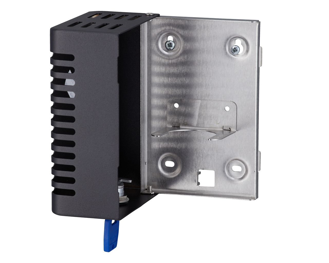 wymuszoną jedynie przez naturalną cyrkulację powietrza w pomieszczeniu (bez baterii, bez aerozoli, bez emisji szkodliwych gazów). Wykonany ze stali nierdzewnej pokrytej specjalną strukturalną czarną powłoką. Zabezpieczony trwałym stalowym zamkiem bębenkowym, zamek zlicowany z powierzchnią urządzenia. Łączenia boków spawane i szlifowane, niewidoczne zawiasy. Zamykany na kluczyk. Możliwość montażu na ścianie lub używania jako urządzenie wolnostojące.