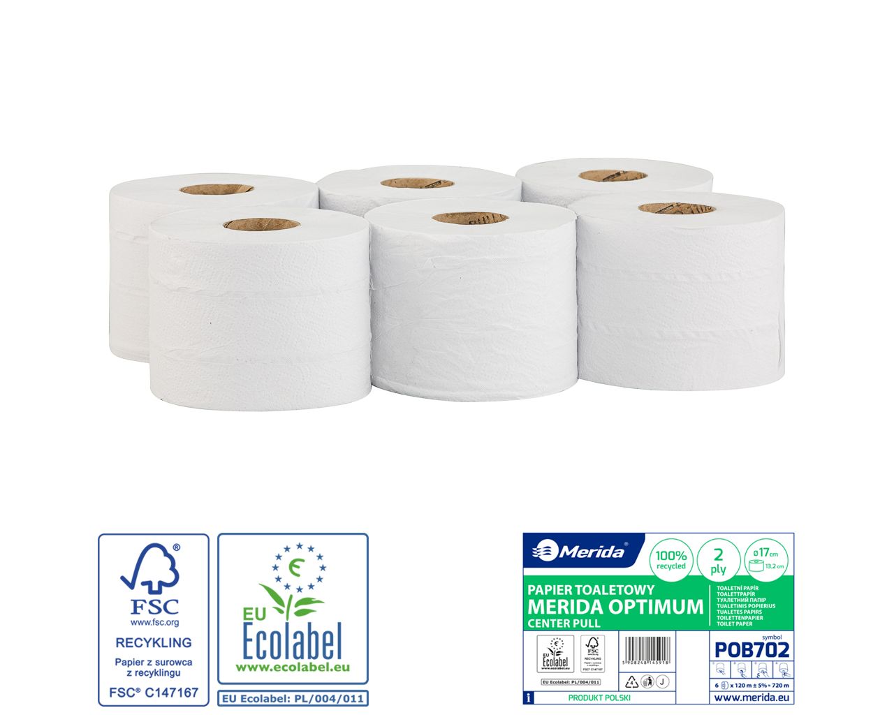 Papier toaletowy MERIDA OPTIMUM CENTER PULL białyśrednica 17 cm, długość 120 m, dwuwarstwowy, zgrzewka 6 szt.ECOLABEL