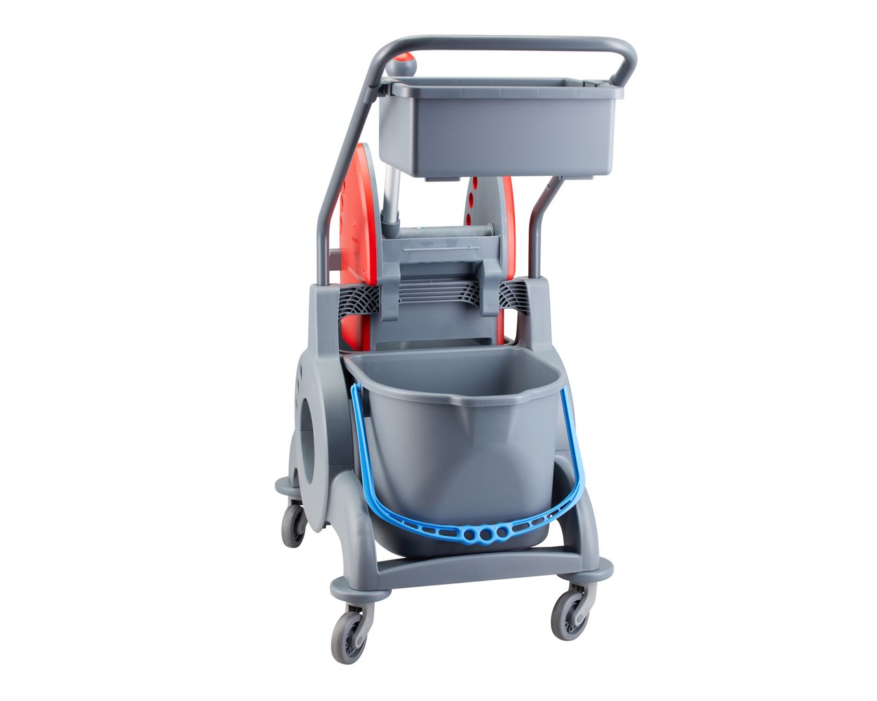 Wózek serwisowy do sprzątaniadwuwiadrowy, 2× wiadro 15 l, kuweta 8 lczerwona prasa